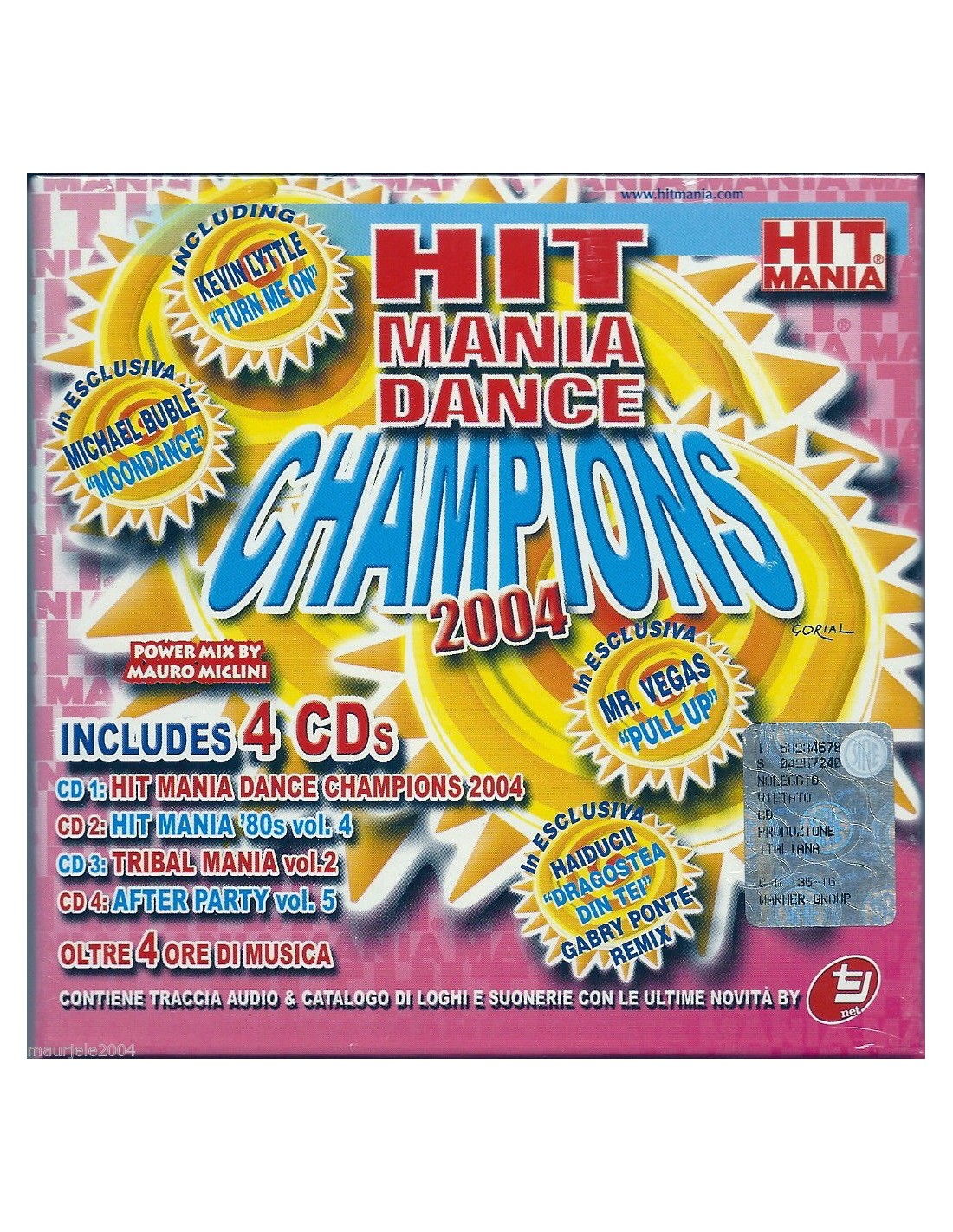 Cofanetto 4 CD Originale, Nuovo e Sigillato Hit Mania Dance Champions 2004 - Artisti Vari (2004) Track listing CD1 : Hit Mania Dance Champions 2004 1. Kevin Lyttle - Turn Me On 2. Haiducii - Dragostea Din Tei 3. M@d - The Concert 4. Brothers - The Moon 5. Lmc Vs U2 - Take Me To The Clouds Above 6. Altar - Sexercise 7. Mat's - Rock The Drum 8. Memi Vs Bini & Martini - Dance (Disco Heat) 9. Ana Flora Feat B-fonic - Cores 10. Junior Jack - Stupidisco 11. Doctor Cover - Come & Get It 12. Gigi D'agostino - Silence 13. Gipsy - Gipsy 14. Benassi Bros. - Hit My Heart 15. Gigi & M - Con Il Nastro Rosa 16. Playmate - Mind Your Own Business 17. Sandy Wilhelm Pres. Subway - Promise Land 18. Sissoko - Believe 19. Mr Vegas - Pull Up 20. Sean Paul - I'm Still In Love With You 21. Savan - All To The Dance 22. Michael Buble' Moondance Track listing CD2 : Hit Mania '80s vol.4 1. Wham! - Wake Me Up Before You Go Go 2. Earth Wind & Fire - Boogie Wonderland 3. Simply Red - The Right Thing 4. Chic - Everybody Dance 5. Delegatioon - You And I 6. Evelyn Thomas - High Energy 7. Novecento - Movin On 8. Tony Esposito - Kalimba De Luna 9. Peter Jaques Band - Is It It? 10. Sandy Marton - People From Ibiza 11. Mike Francis - Night Time Lady 12. Firefly - My Desire 13. Twilight - Star 14. Nina Hagen - African Reggae 15. Hottanta Tunes - Tjnet Track listing CD3 : Tribal Mania vol.2 Megamix 1. No Music No Vocal 2. Here We Are 3. Wagugu 4. No Music No Vocal 5. The Power Of Water 6. Peace And More 7. The Power Of Water 8. Solitude 9. Thunder 10. Magic Fire 11. My Soul My Body 12. Inside The Night 13. Chant Feliz 14. Wasabi 15. Force 16. Big Faith 17. Afro Sushi 18. Let's Clean Up The Jungle Track listing CD4 : After Party Compilation vol.5 1. Ricardo Eberspacher - Light Signs 2. Rumba De Mar - Elisir 3. Caravan - Spread 4. Memory Tree - The Difference 5. Fa.To. Feat. Sunny - Voices From Mars