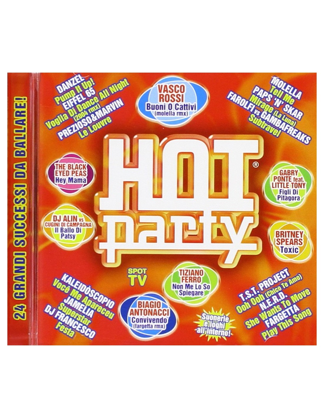 CD Originale, Nuovo e Sigillato Hot Party Summer 2004 - Artisti Vari (2004) Track listing CD: 1. Vasco Rossi - Buoni o Cattivi (molella rmx) 2. Biagio Antonacci - Convivendo (fargetta rmx) 3. Gabry Ponte feat. Little Tony - Figli di Pitagora 4. Paps'n' Skar - Mirage (la luna) 5. Danzel - Pump it up! 6. Molella - Tell me 7. Prezioso & Marvin - Le Louvre 8. Danijay - Luna nera 9. Gigi & Molly - Soleado (molella mix) 10. Eiffel 65 - Voglia di dance (2004 rmx) 11. Farolfi vs. Gambafreaks - Subtravel 12. DJ Alin vs. Cugini di Campagna - Il ballo di Patsy 13. Fargetta - Play this song 14. Mousse T. feat. Emma Lanford - Is it' cos i'm cool? 15. Whigfield - Was a time 16. Maria - To nem ai 17. Kaleidoscopio - Vocè ma apareceu 18. T.S.T. Project - Ooh Ooh (chici te amo) 19. Jamelia - Superstar 20. Britney Spears - Toxic 21. DJ Francesco - Festa 22. The Black Eyed Peas - Hey Mama 23. N.E.R.D. - She wants to move 24. Tiziano Ferro - Non me lo so spiegare Distribuzione : Universal Music (2004) Barcode : 0602498211748