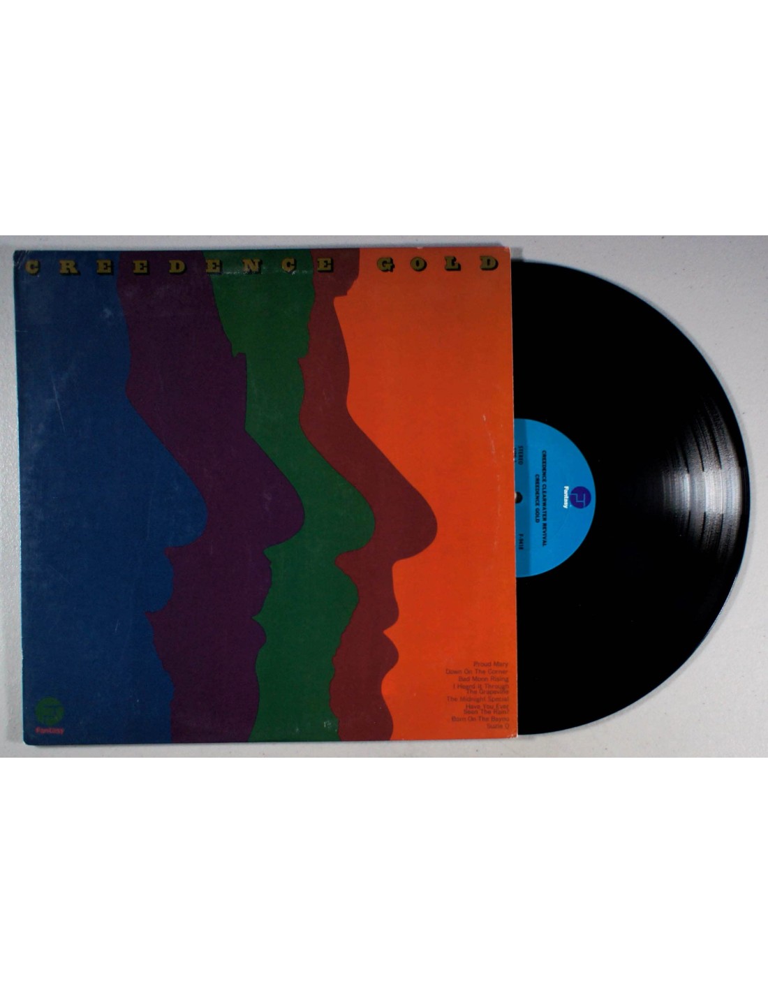 CREEDENCE CLEARWATER REVIVAL Creedence Gold (1973 UK issue Fantasy label 8-track vinyl compilation LP arranged and produced by John Fogerty featuring a series of classic hits taken from their best selling gold disc certified albums. Includes Proud Mary Bad Moon Rising and the full length versions of I Heard It Through The Grapevine and Suzie Q [produced by saul Zaentz]. Housed in a picture sleeve with different coloured profile silhouettes. The sleeve displays some light ringwear but is overall in excellent shape and the vinyl within remains pristine - Stunning play copy showcasing timeless Creedence! FT501)
